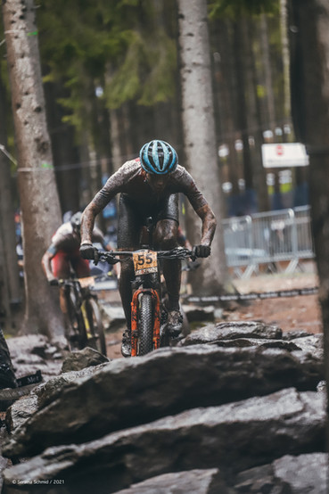 Das Rennen von Simon hatte in der zweiten Runde eine unfreiwillige Pause. Er rutschte auf einer Wurzel aus und landete im Dreck. Der Sturz an sich war überhaupt nicht schlimm, da fast jeder Fahrer in diesem nassen Rennen mit wenig Gripp so einen Zwischenfall hatte. Doch beim Sturz verschob es ihm den Lenker. Er brauchte eine Weile bis er sein Bike wieder gerichtet und fahrbereit hatte. Danach zeigte er eine solide Aufholjagt und wollte wieder weiter nach vorne. Nach sieben Runden kam er letztendlich als 38. ins Ziel.
